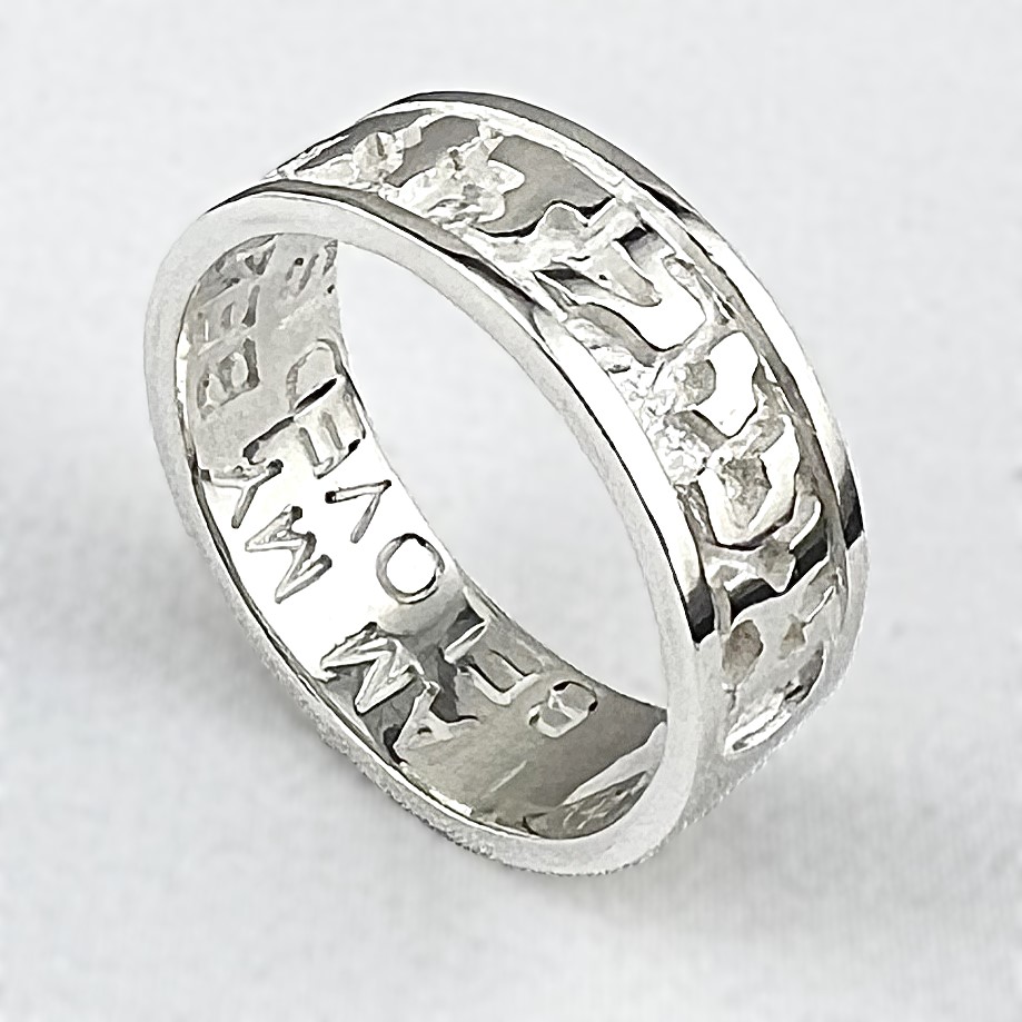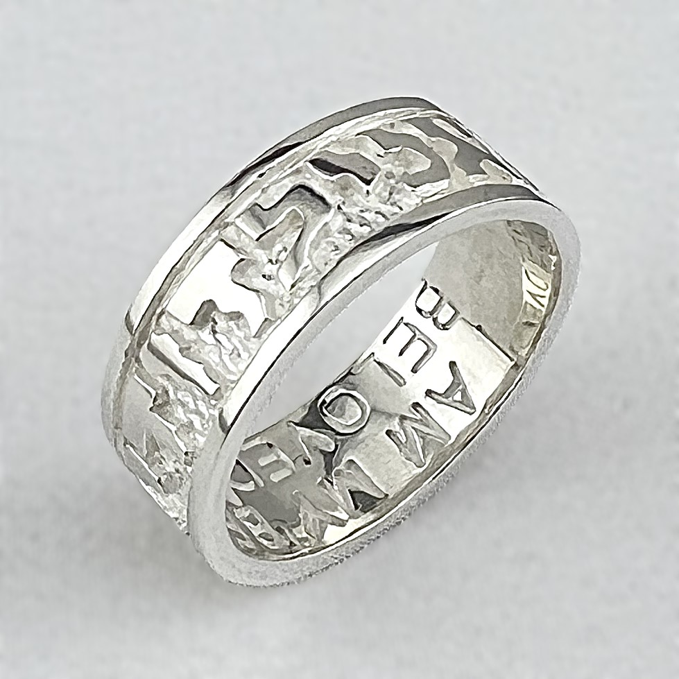 Solid sterling silver 925 with 'Ani Ledodi Vedodi Li' inscribed in Hebrew. Width 7.5 mm. 'I AM MY BELOVED'S AND MY BELOVED IS MINE-SONG OF SONGS 6:3 inscribed on the inside of ring. Please specify ring size at the end of your order under "Comments and Special requests."