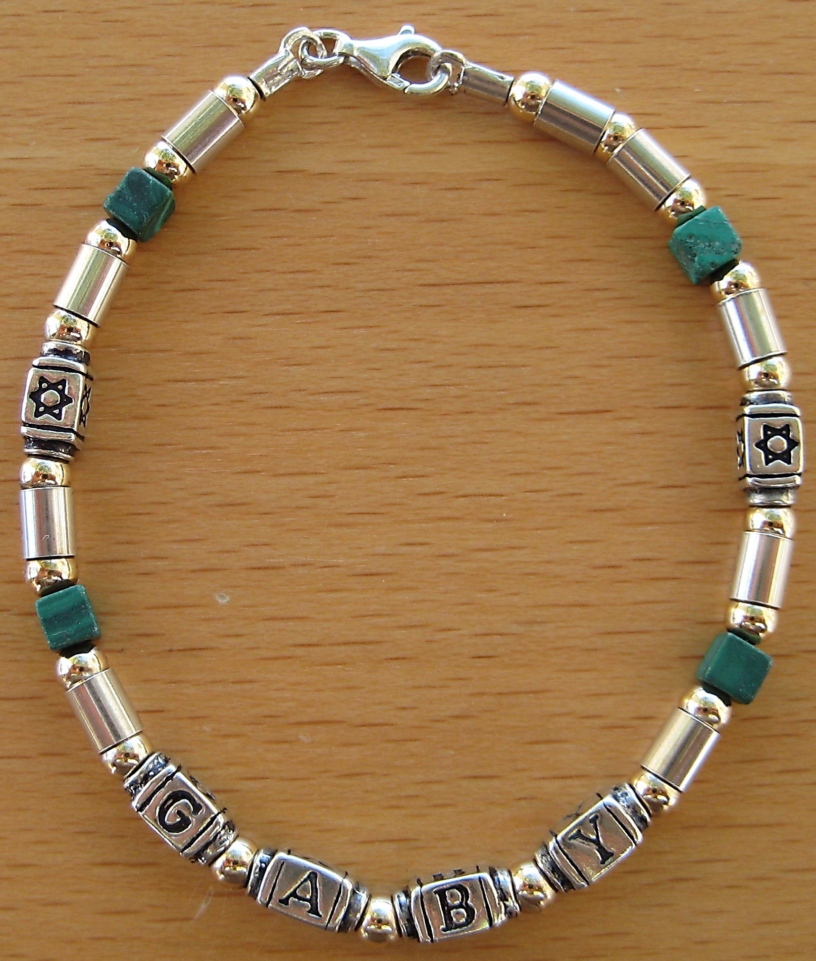 Sterling silver beads alternated by 20 micron 14K balls and genuine Eilat stones, strung on a durable strerling silver chain. Customized to spell your name in Hebrew or English.