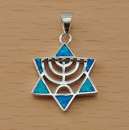 Sterling silver Star of David pendant with menorah in the center. Inlaid with Opalite.